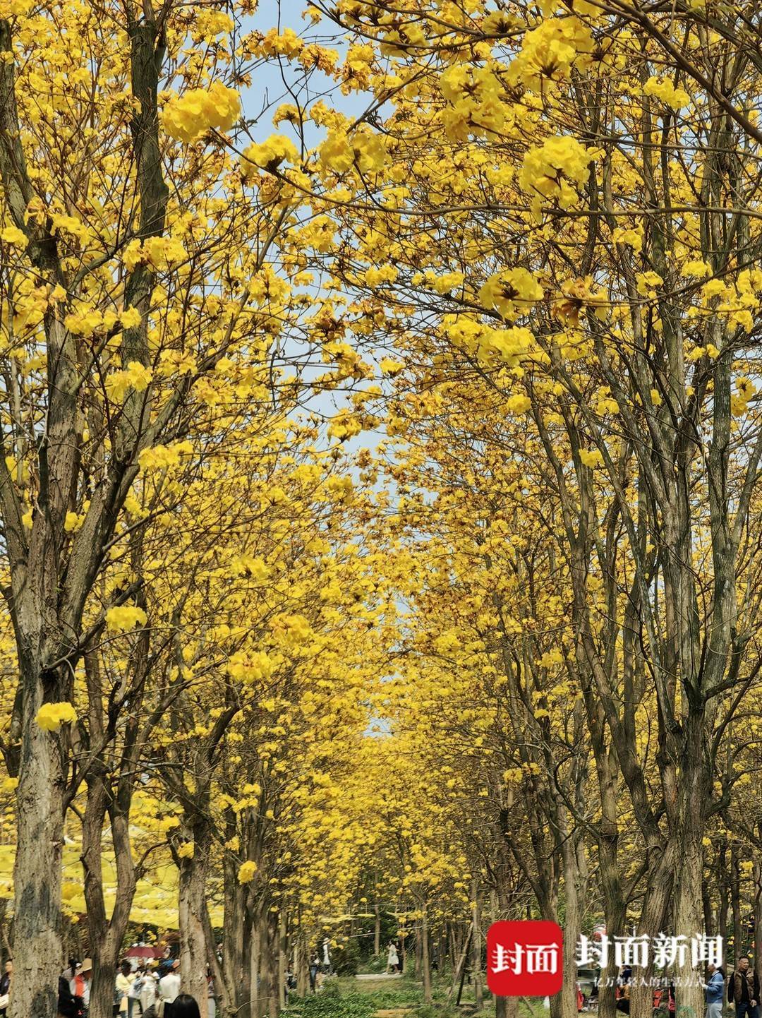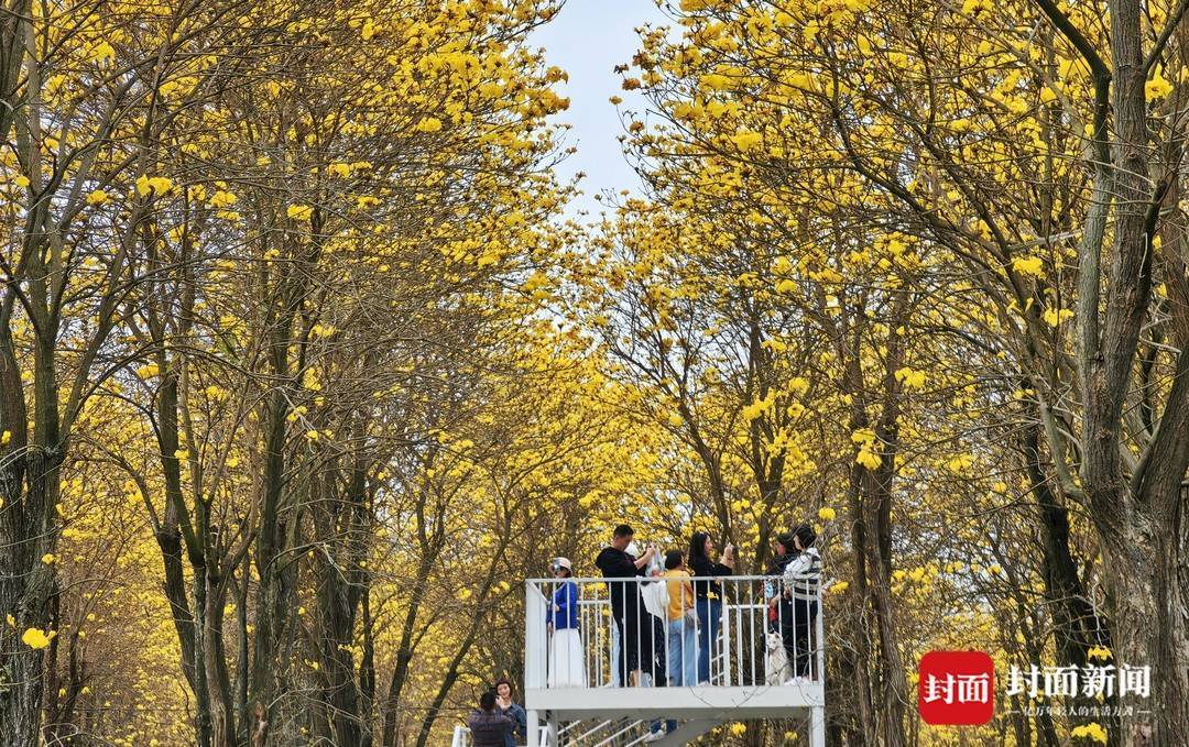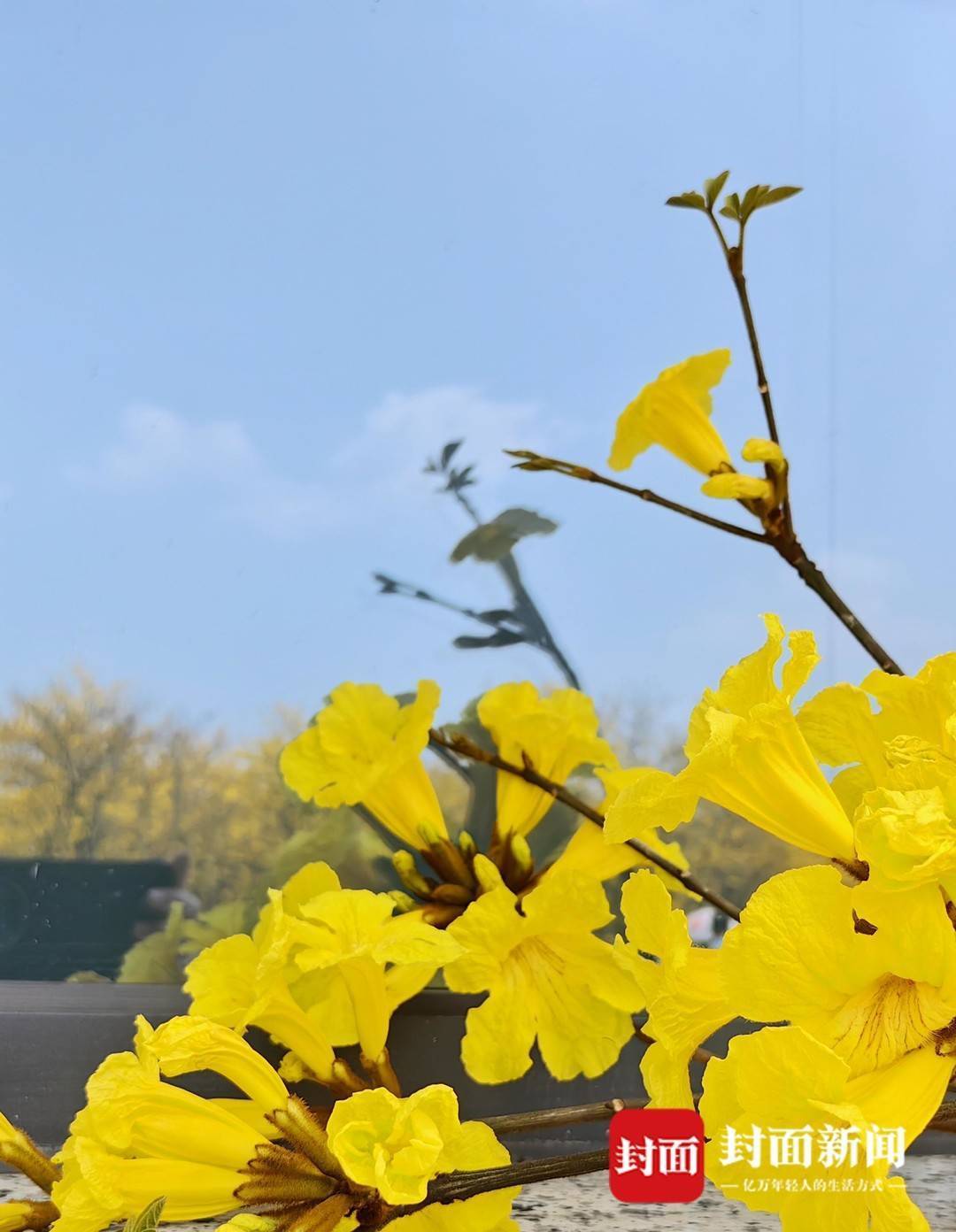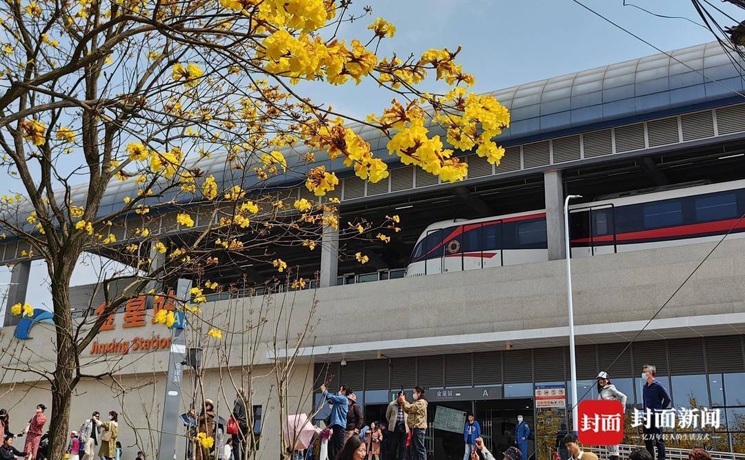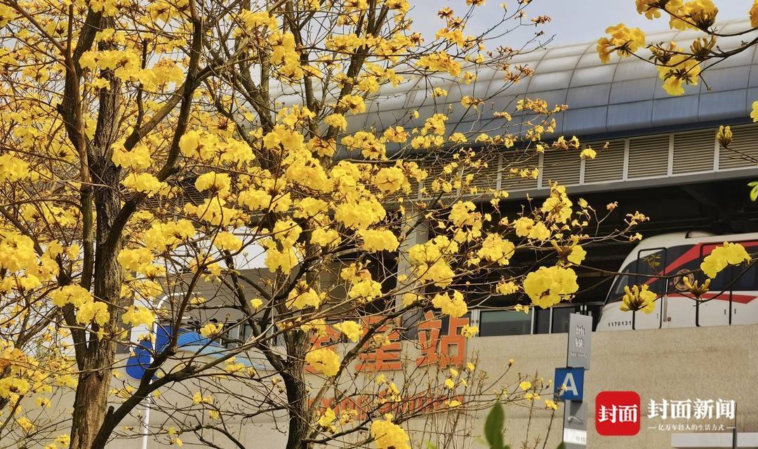 地铁17号线金星站外有一片黄风铃木花正在盛开,当列车驶入站前,车窗外金黄色的风铃木花映入眼帘。春光明媚、风和日丽的周末,众多市民在这里赏花打卡。
