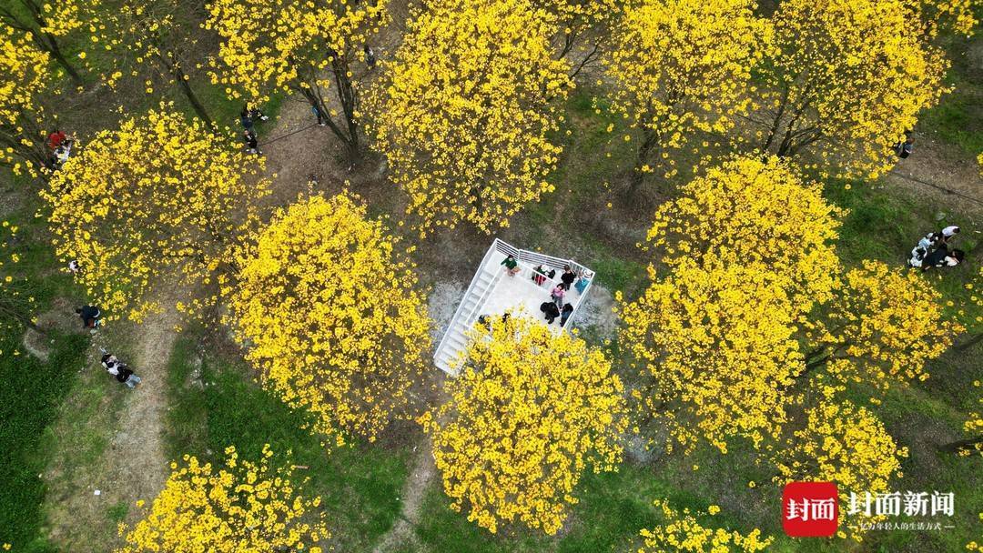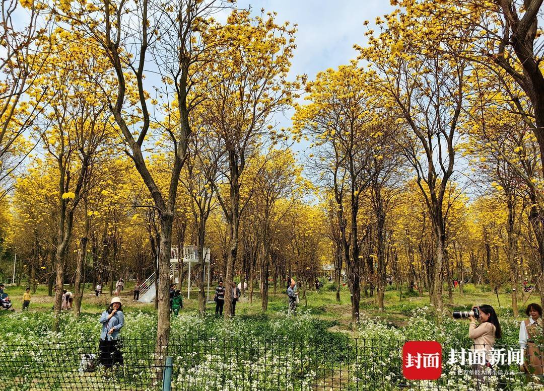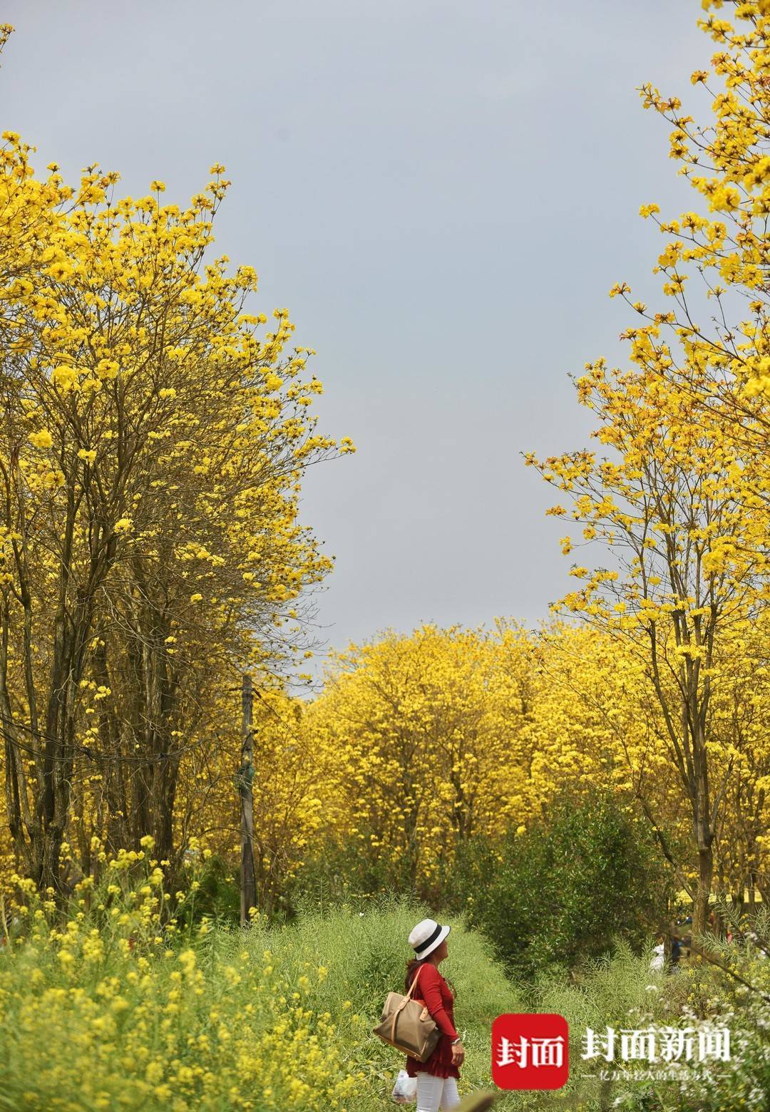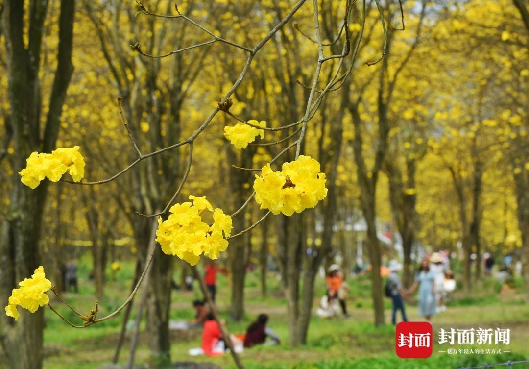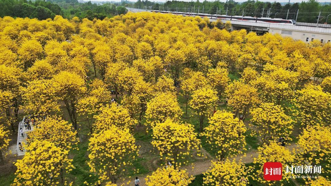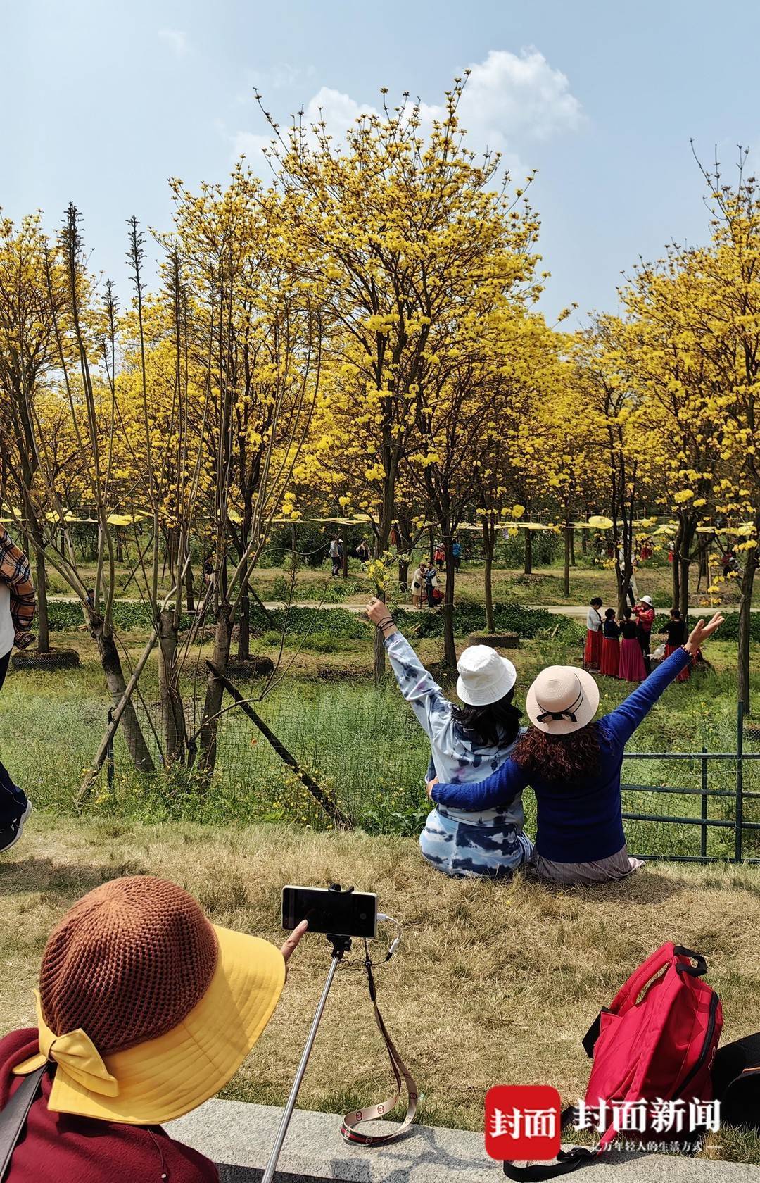 地铁17号线金星站外有一片黄风铃木花正在盛开,当列车驶入站前,车窗外金黄色的风铃木花映入眼帘。春光明媚、风和日丽的周末,众多市民在这里赏花打卡。