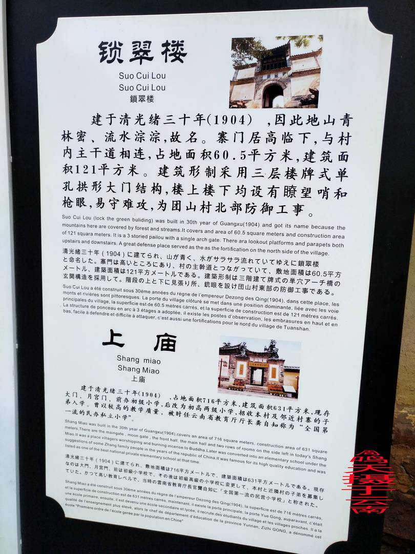 至清末,张氏族人积极参与个旧锡矿开发,挣得巨额钱财,皆回乡建盖豪宅,光耀门庭。现存保存完好的大型民居15座,寨门3座,寺庙3坐,宗祠1座,祖茔1座,占地面积18384.5平方米,建筑面积16158平方米。其形制规整,布局灵活,空间景观丰富,内雅外秀,建筑精美,工艺精湛,表现了滇南民居建筑的典型特征,代表了云南地方本土建筑发展的最高水平,是考察中国近代地方民营工商业发展的重要实物资料。