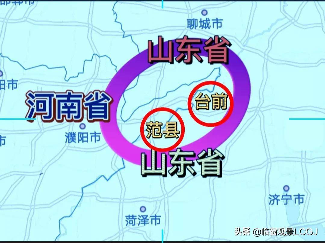如果您细心地观察河南省的地图,会发现在地图的东北部有一块东、南、北三个方向都被山东省包围的地方,而且这块地方的形状像极了一个人向外蹬出的一脚(如图),这个地方就是河南省的范县与台前县。