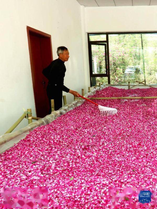 4月9日,在四川省眉山市仁寿县藕塘镇,村民在晾晒玫瑰花。