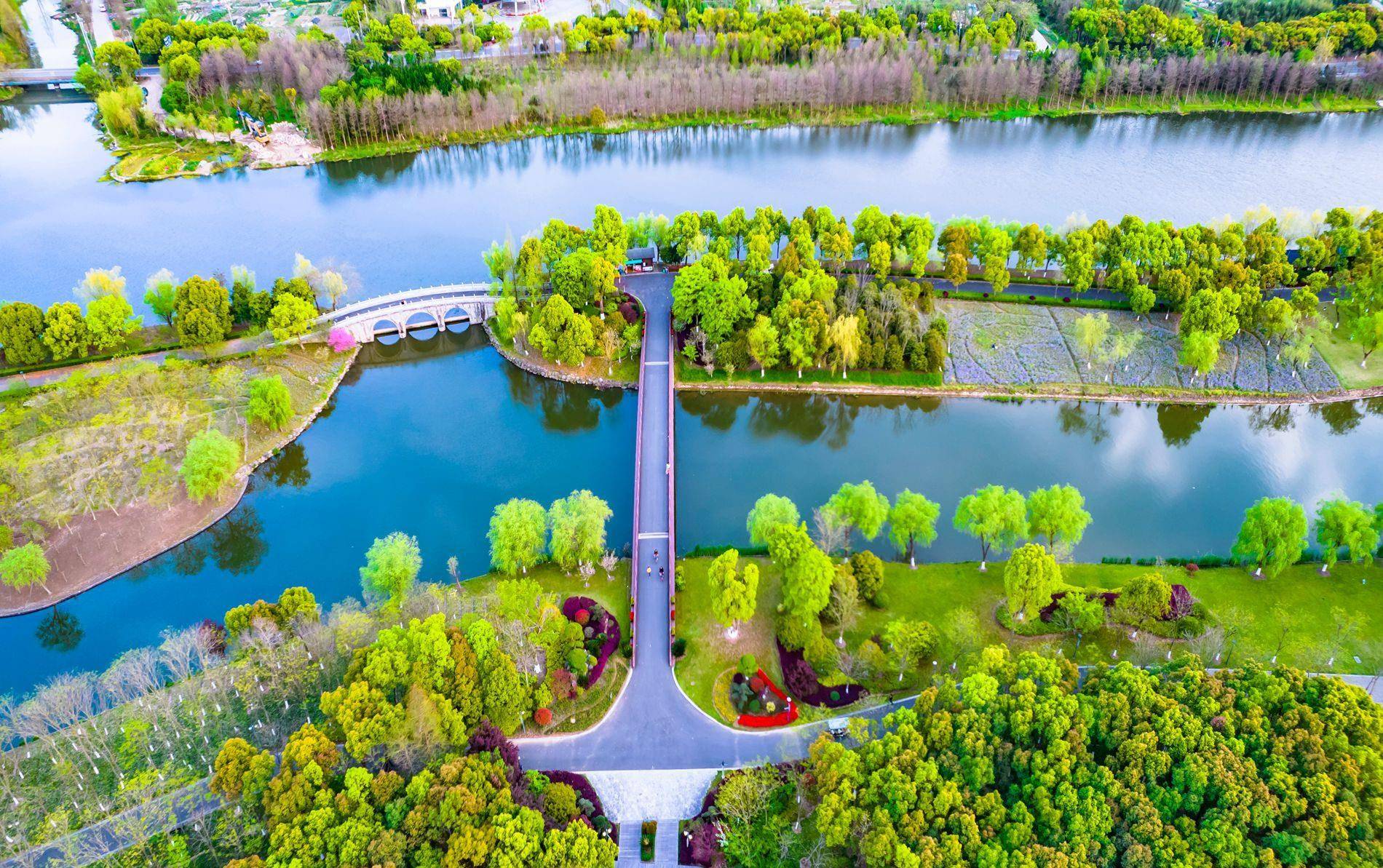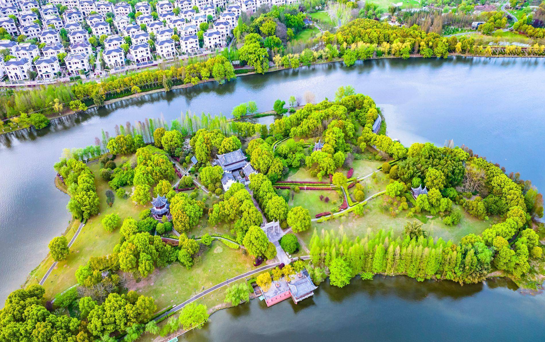 从高空俯瞰,典雅的中式建筑尽显古色古香,亭台楼阁和小桥流水掩映在葱茏绿意中,静谧而美好。