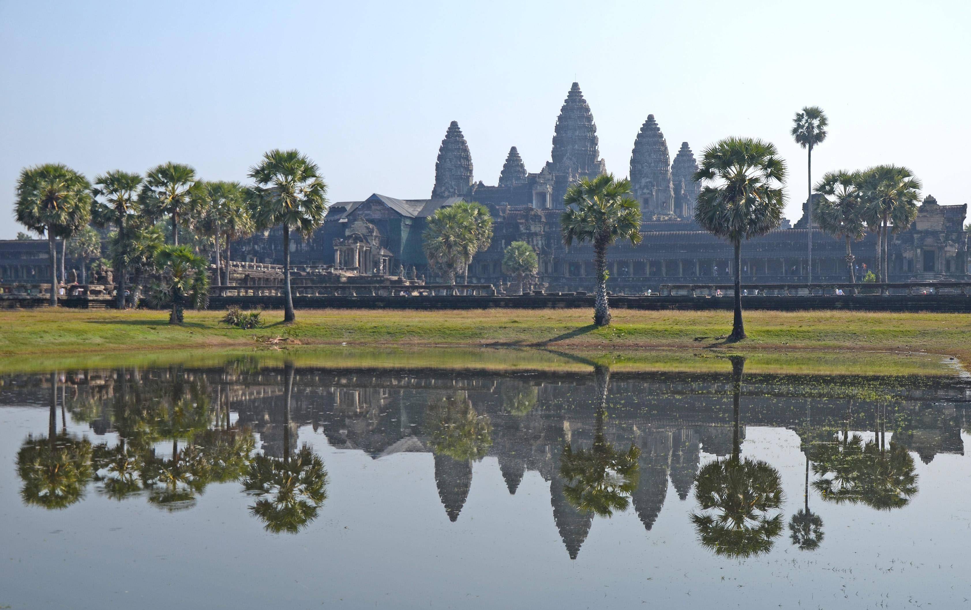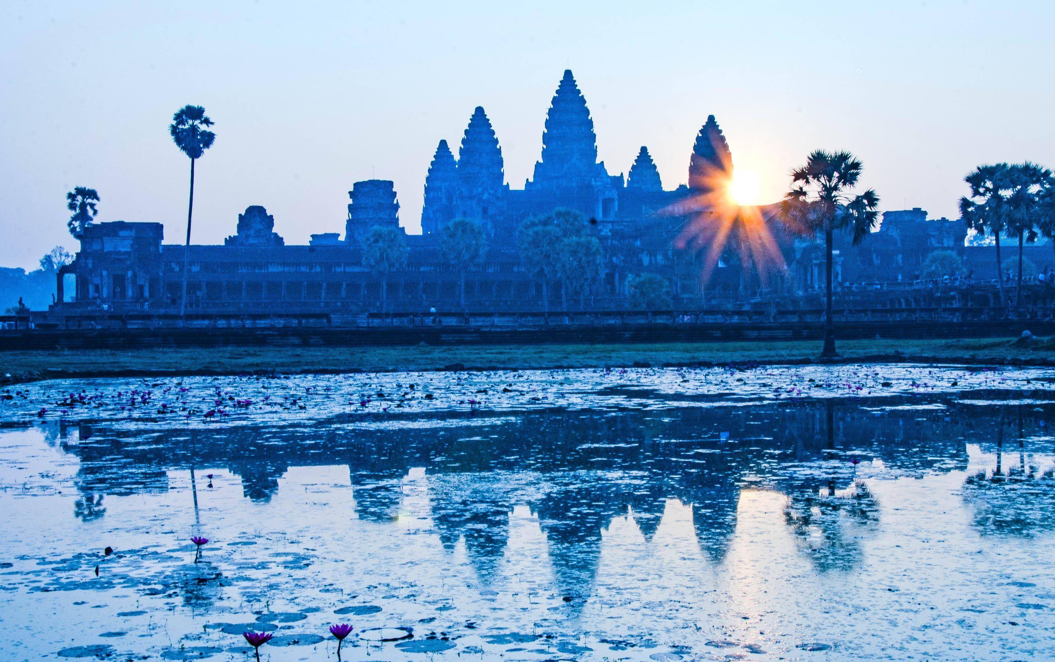 吴哥寺位于柬埔寨西北部,坐东朝西,呈长方形分布,东西长1500米,南北宽1300米,周长达5.6公里,寺庙中间的金字塔式寺庙是最高层,其间立有五座宝塔,是吴哥窟最标志的景观,我们时常在各种旅游宣传资料上能看到。