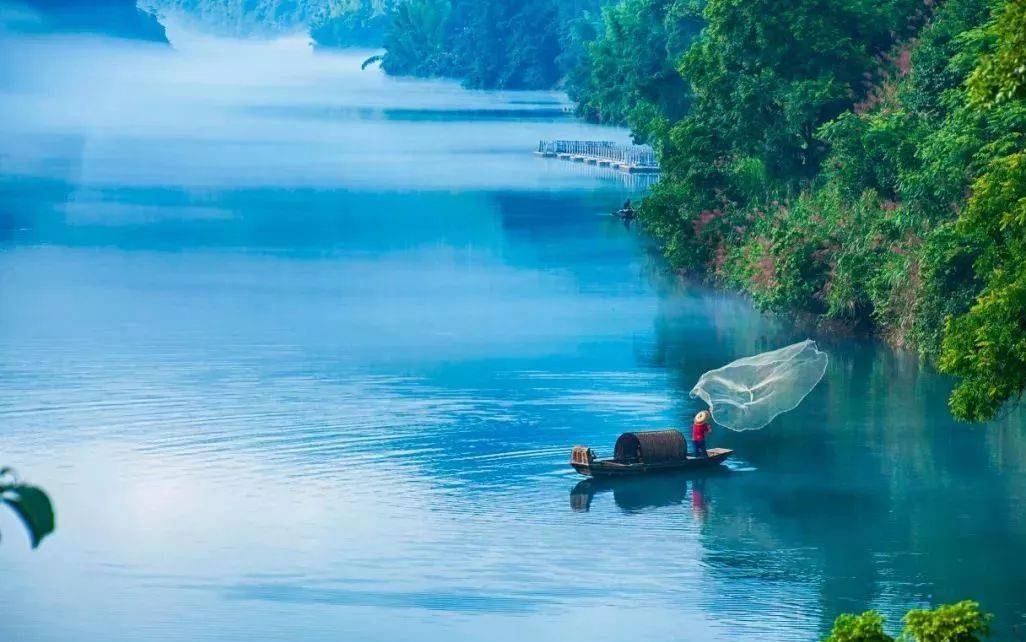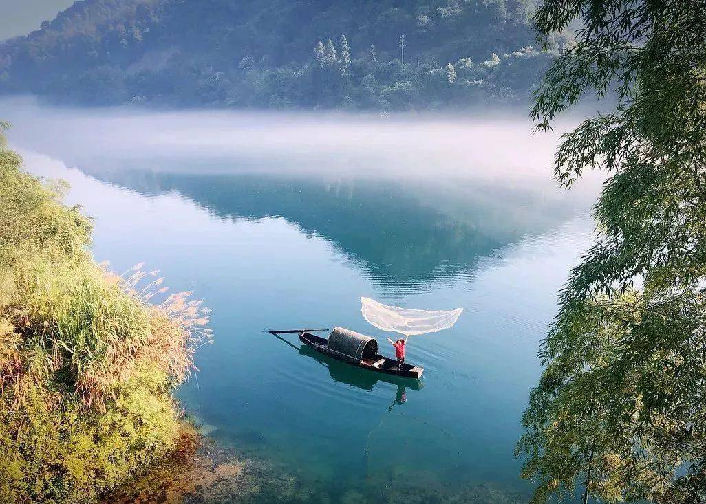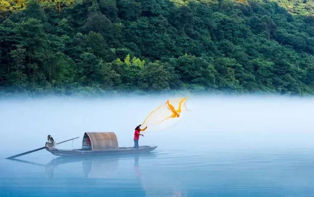 雾气升腾的江面迷蒙得恍如仙境,渔人撸桨划舟,到江中挥手将渔网往外撒出,一派祥和的渔牧之景,这里就是郴州小东江。