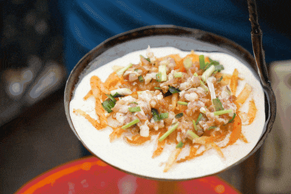 当天宰杀的热乎乎的猪肉、猪小肠、猪肝、猪血、猪肺,白灼出锅,堆在雪白的榨粉上,再配一根老式油条,吃一口粉,呷一口大骨熬出来的清汤,那感觉,倍儿爽!