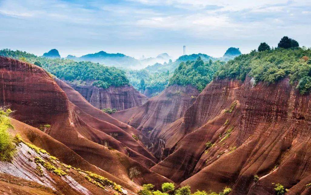 不同于别处,高椅岭丹霞地貌周边有漂亮的水洼点缀,从高空俯瞰,每座山就像是一座岛屿,镶嵌在宝石般碧蓝的水中。
