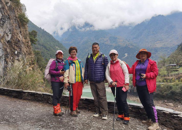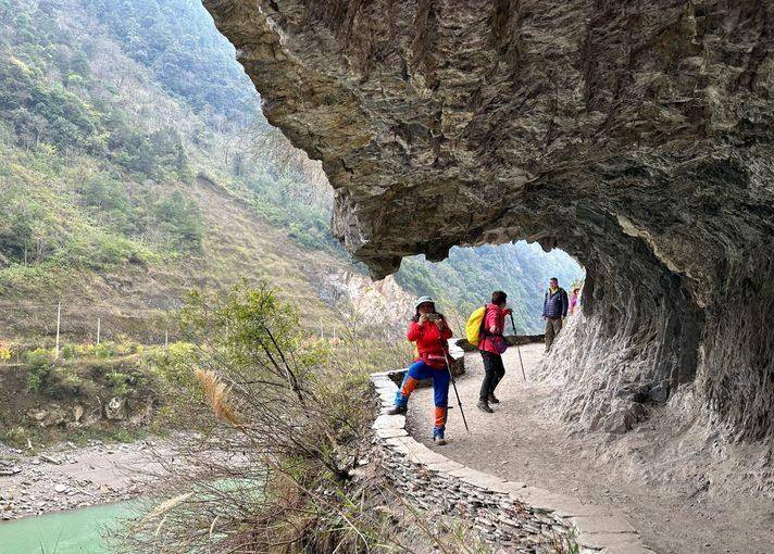抄近路好、却也容易有状况。眼看着就要接近上村庄的道路了,我们却遭遇一段难行的路段,因为雨水冲刷、因为发生过泥石流,我们遇到了一段需要手脚并用的路段,大家小心翼翼走过......行走路上的风景,总是最独特的体验。10人小分队合影留念,以记录这段有趣的经历。