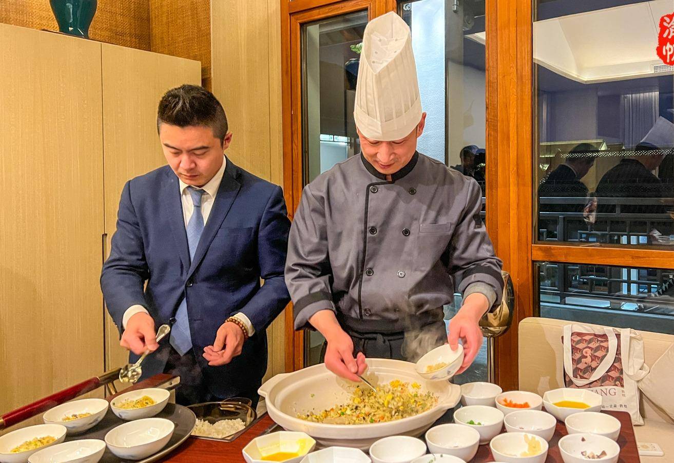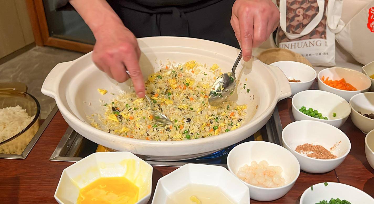 大厨一边讲解,一边给我们现场炒制,他说扬州炒饭的历史可以追溯到隋朝,隋炀帝特别喜欢吃,还有一个好听的名字叫“碎金饭”,炒的时候有很多讲究,比如要用隔夜的灿米或新粳米饭,口感才更好,饭粒更饱满,也更弹牙;香葱不要一次性加入,先加一些是为了调味,最后再放一些则可以调色。其间还要注意火候,只有注意细节,炒出来的米饭才会颗粒分明、软硬有度、光泽饱满、鲜嫩滑爽、香糯可口。