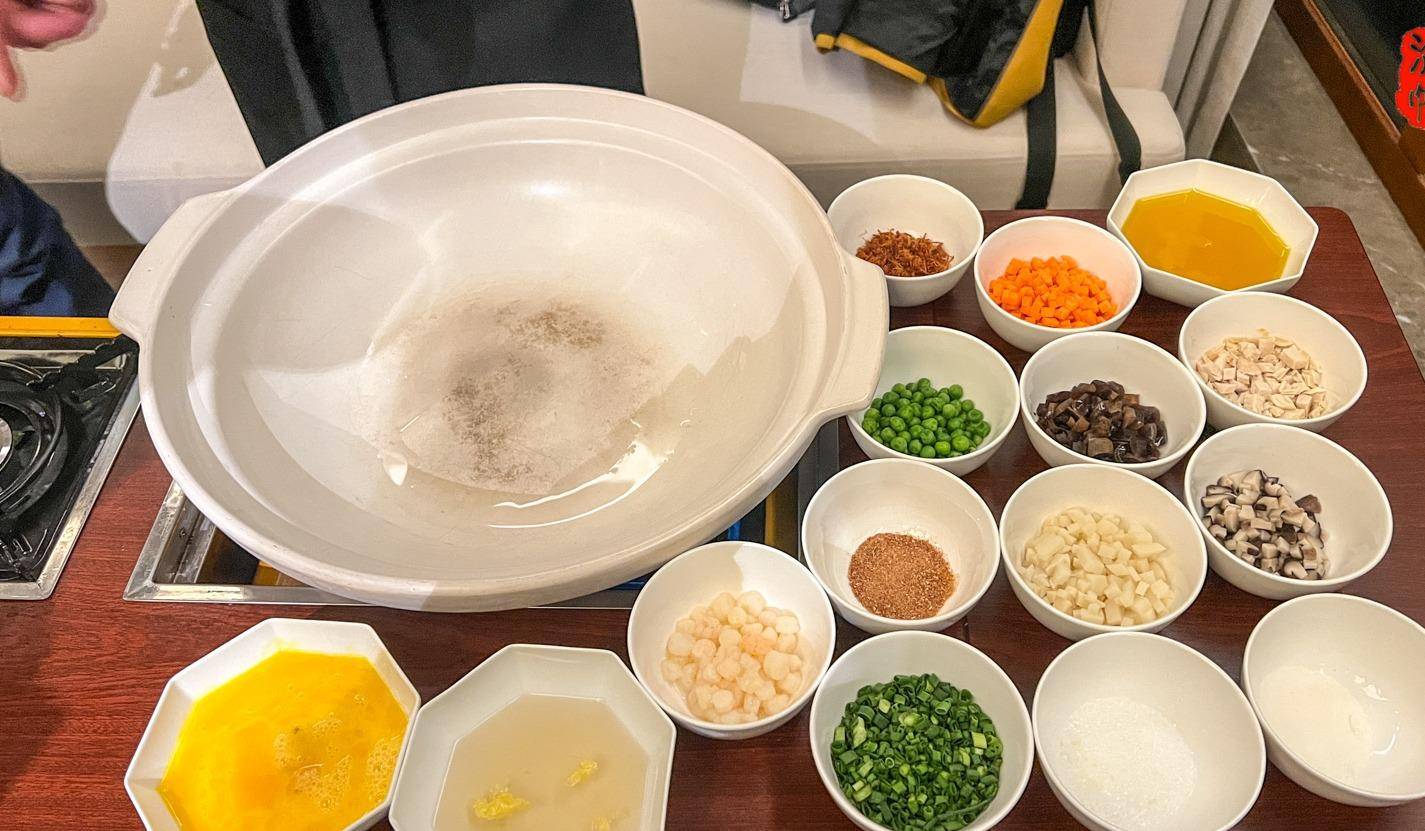 最为有趣的当属扬州炒饭了,我们吃到中途,大厨推着小车进来,小车上不仅有锅灶,还有十几个装有虾仁、海参、鸡腿肉丁、火腿丁、贝粒、蘑菇丁、笋丁、青豆等食材的小碗。