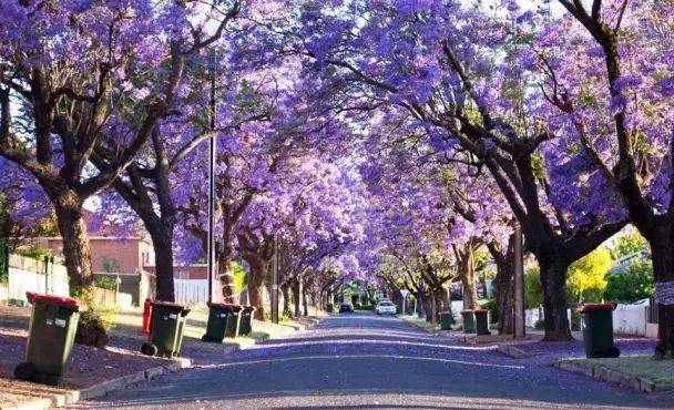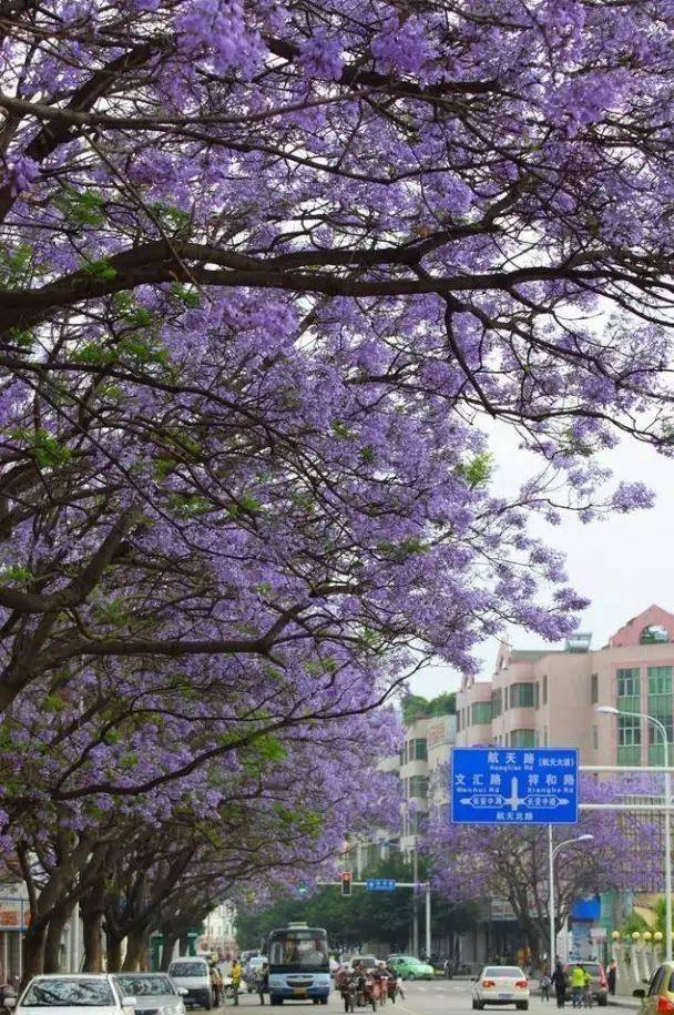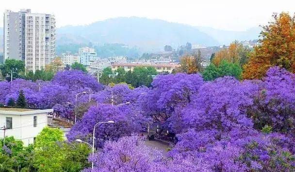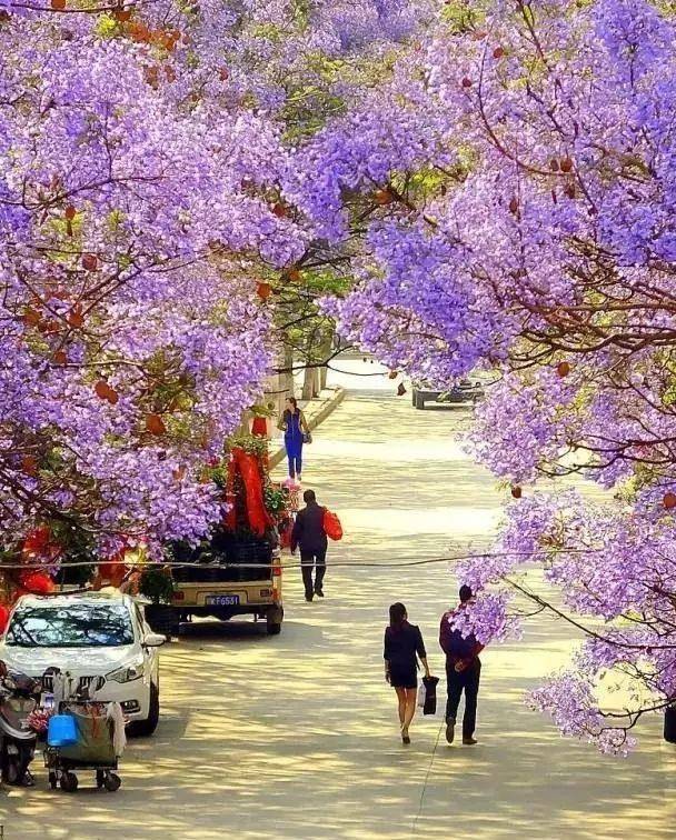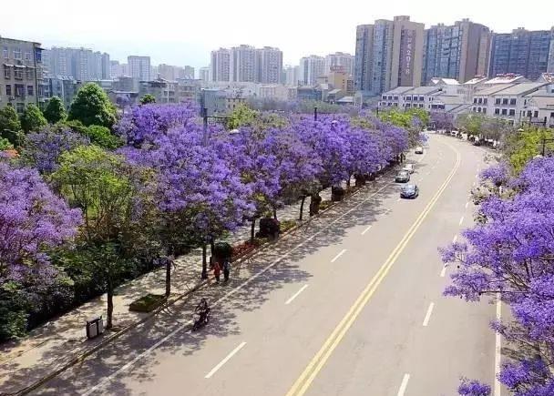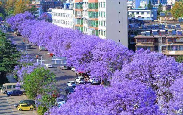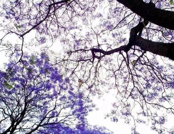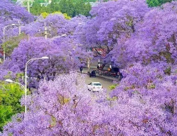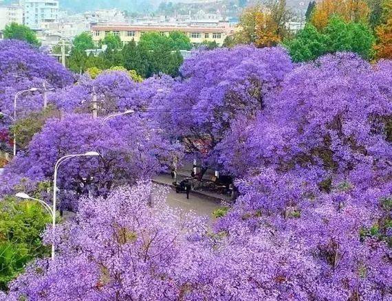 每到4月末,这座城市便开满了灼灼的蓝花楹,其茂盛迷人的程度,完全不输澳洲悉尼的蓝花楹,令人心驰神往。