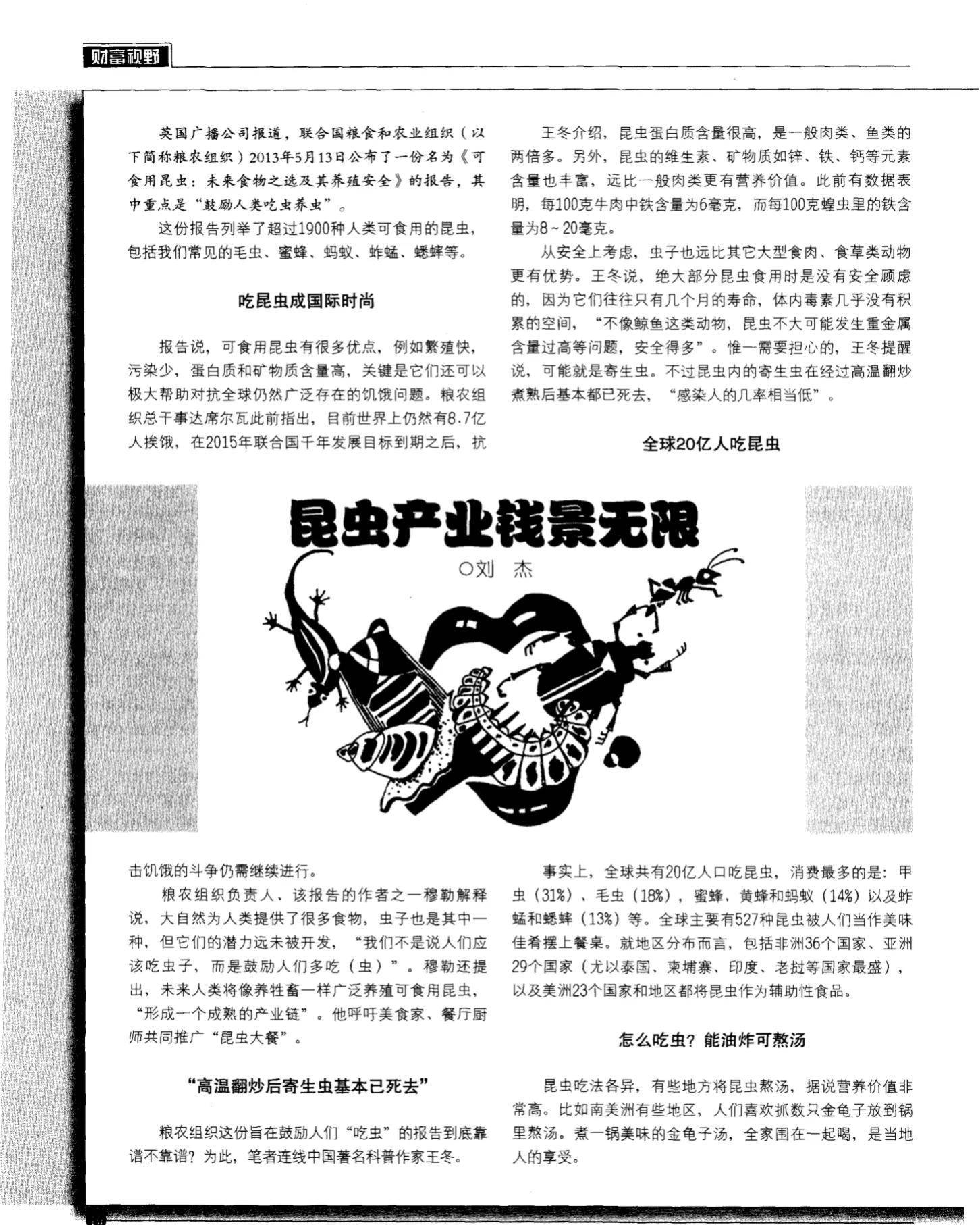 昆虫养殖这一行也属于畜牧业,和养鸡相当类似,也许起初各种反对,得到益处之后就习以为常了。粮农组织(FAO)在9年前曾表示,全世界大约有20亿人将昆虫纳入了饮食习惯中。全世界有1900种可食用昆虫,成为人类的盘中餐。