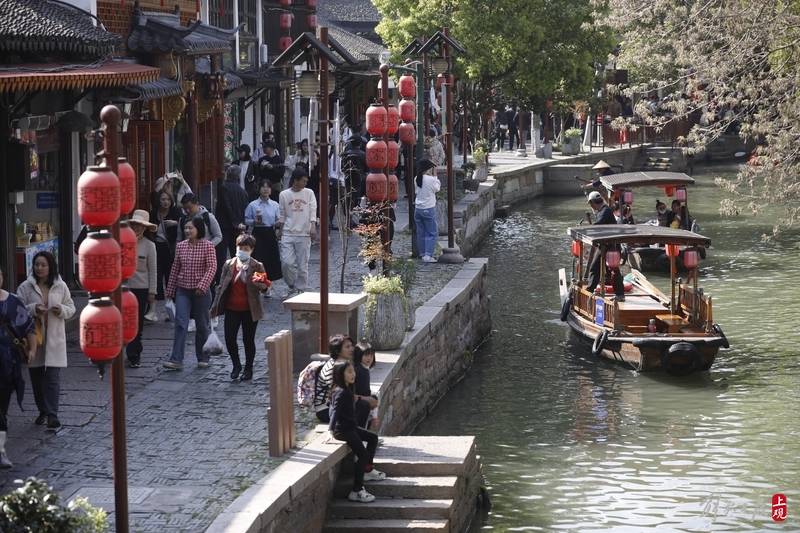 2023年4月9日,申城天朗气清,位于青浦的江南水乡古镇朱家角,迎来大量游客前来游览,感受明媚春光。