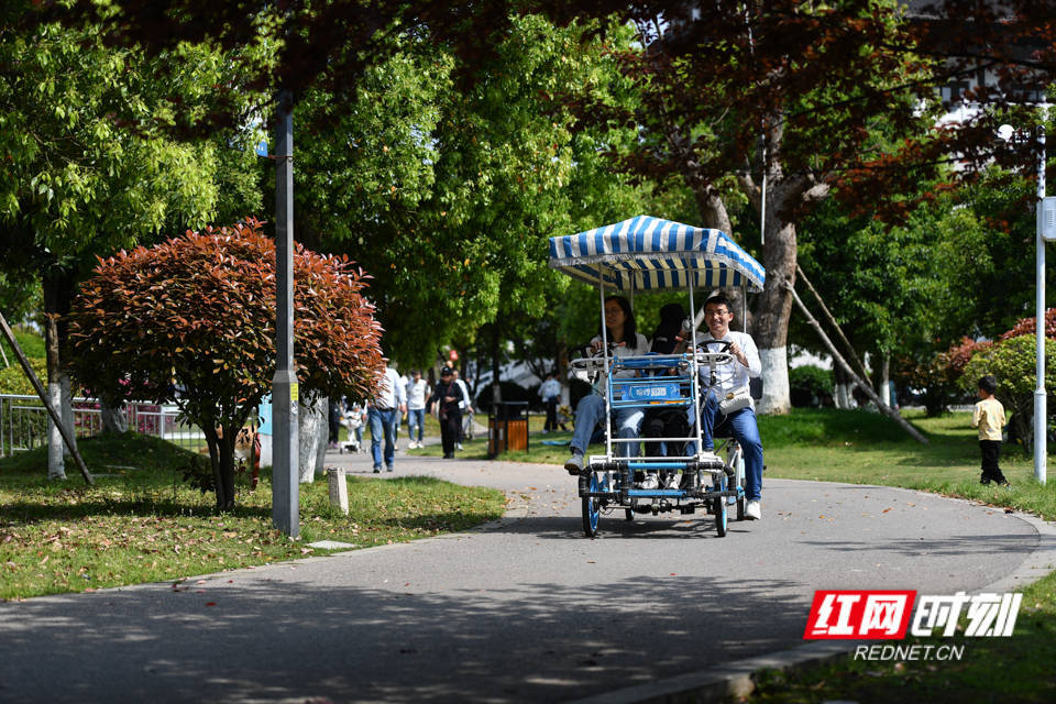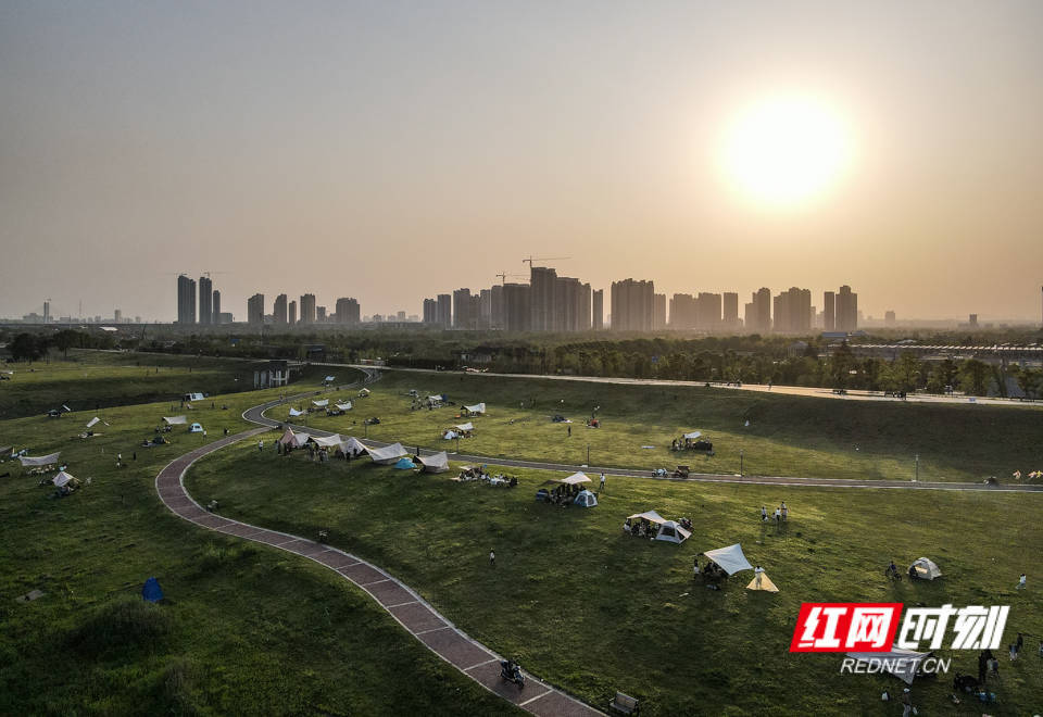 湘潭万楼附近的江滩大草坪上,是一片帐篷的海洋。野餐、放风筝、赏江景……人们在大自然的怀抱中,乐享温馨时刻。