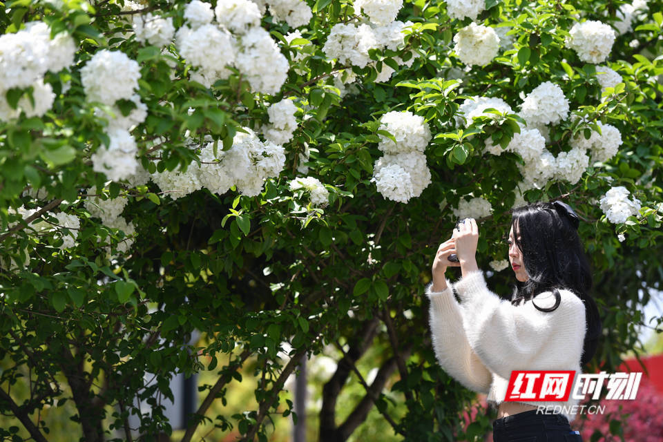 湘潭九华湖·德文化园,一树树木绣球花迎光怒放,芬芳四溢,吸引众多市民拍照打卡。
