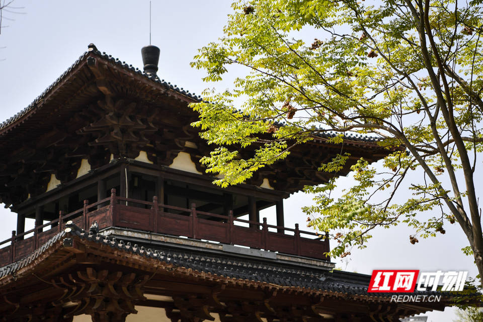 楼阁古朴、新绿葱茏,好一幅春日的美好画卷。