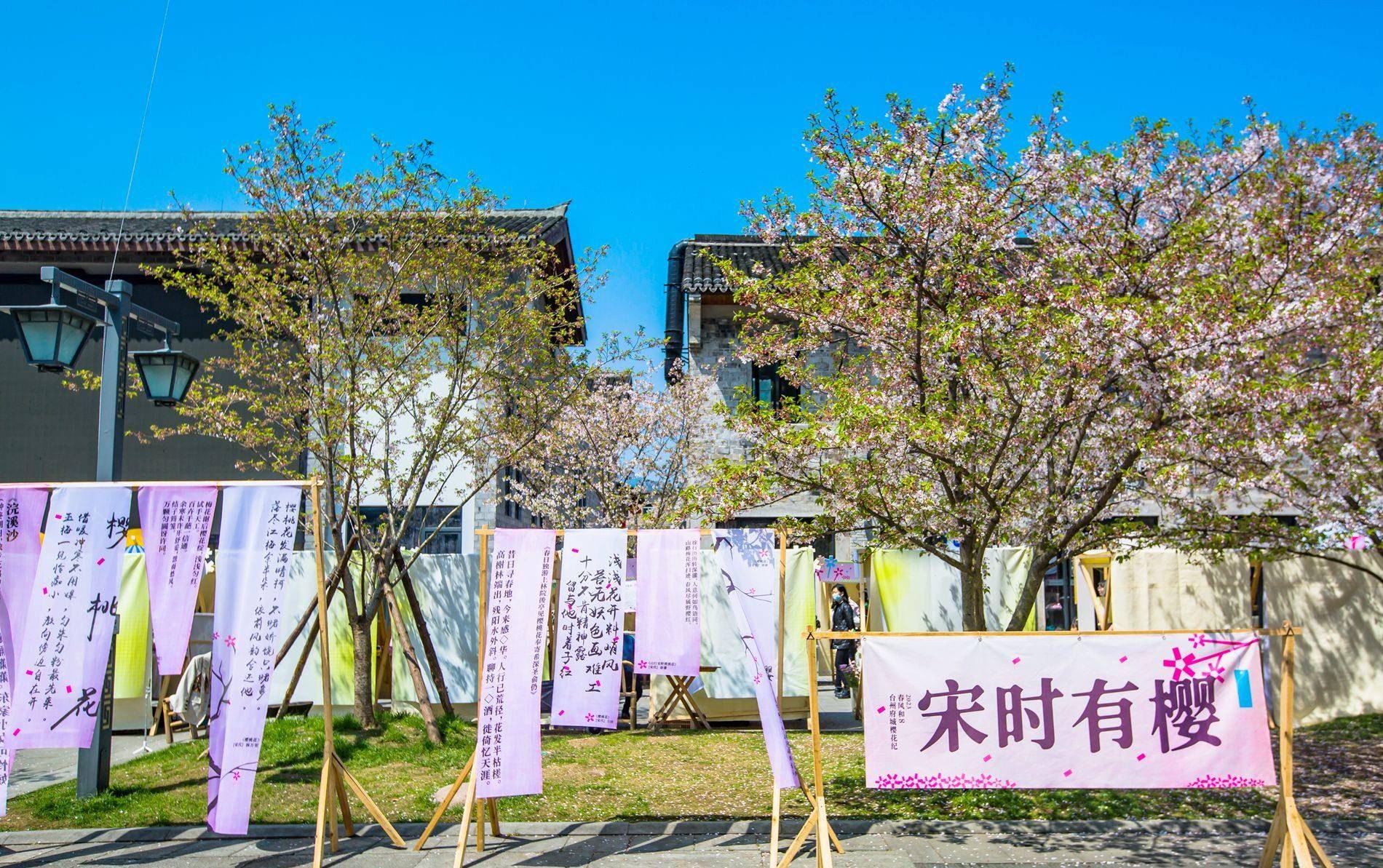 所有街道俨然化身美丽的樱花大道,云蒸霞蔚的花朵衬托着古朴雅致的建筑,随风飘摇的布织上写满诗词,营造出浓浓古风气氛,格外有韵味。