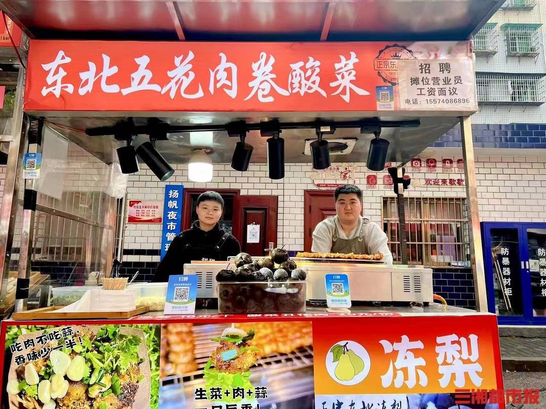4月8日,夜幕降临,位于长沙市芙蓉区的扬帆夜市热闹非凡,众多年轻人闻香而来。摊主中也不乏充满青春活力的身影,“东北五花肉卷酸菜”的摊主小宋(化名)正是其中之一,近1.9米的个头,在人群中格外打眼。