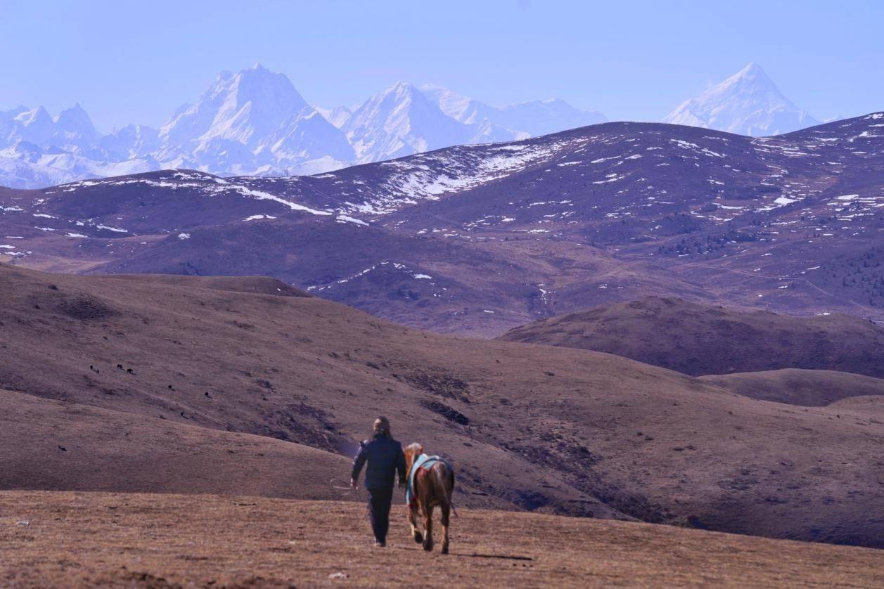一栋小楼,两三猫狗,脚下是花田,花田里住着牛马,牛马不动,人也不想动。就这么坐着望着雪山,似乎也是一种人生追求。