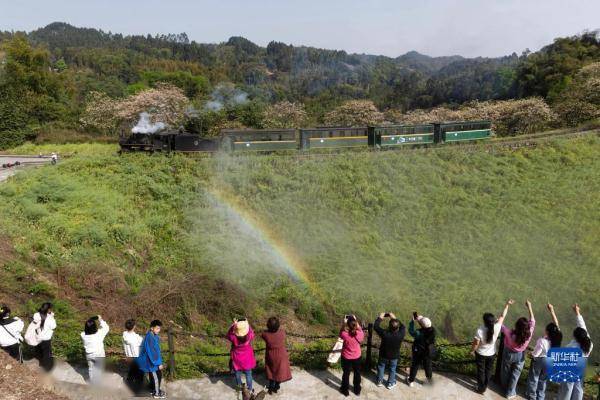 4月9日,一列嘉阳小火车经过亮水沱站的桐子花丛,喷出的蒸汽形成一道彩虹。