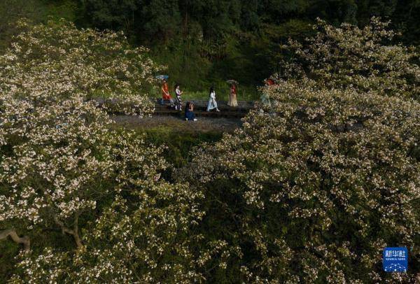 4月9日,游客们在亮水沱站的桐子花丛下徜徉(无人机照片)。