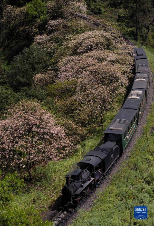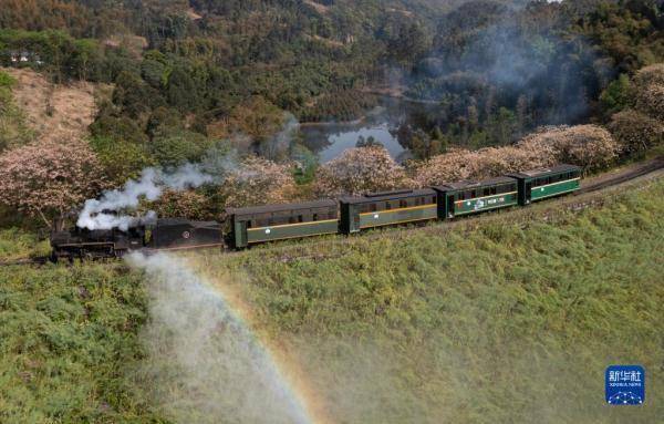 近日,四川省乐山市犍为县桐子花盛开,当地著名的老式窄轨蒸汽火车——嘉阳小火车穿越桐子花丛,鸣笛喷气,在阳光照射下形成一道彩虹,令人惊叹不已。