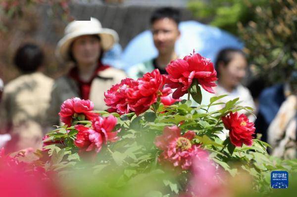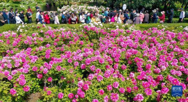 4月9日,游客在河南省洛阳市一牡丹观赏园内观赏牡丹(无人机照片)。
