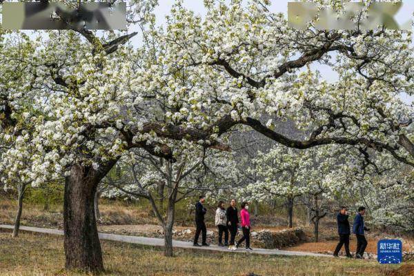 4月9日,游客在河北省迁西县东莲花院镇西山村梨树果园赏花游玩。