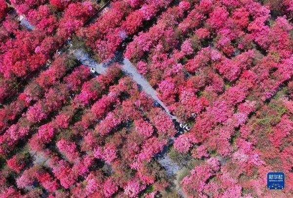 4月9日,人们在江苏无锡九龙湾花彩小镇“杜鹃花迷宫”中游玩赏花(无人机照片)。