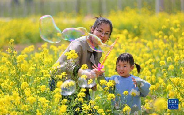 4月9日,家长带着孩子在山东省滕州市洪绪镇一处油菜花田里玩耍。