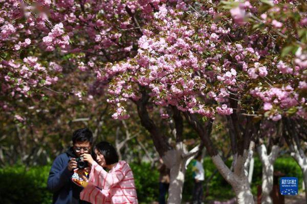 4月9日,游客在山东省济南市森林公园赏花拍照。