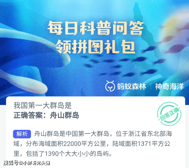 蚂蚁森林之神奇海洋答案:我国第一大群岛是哪里?正确答案:舟山群岛。