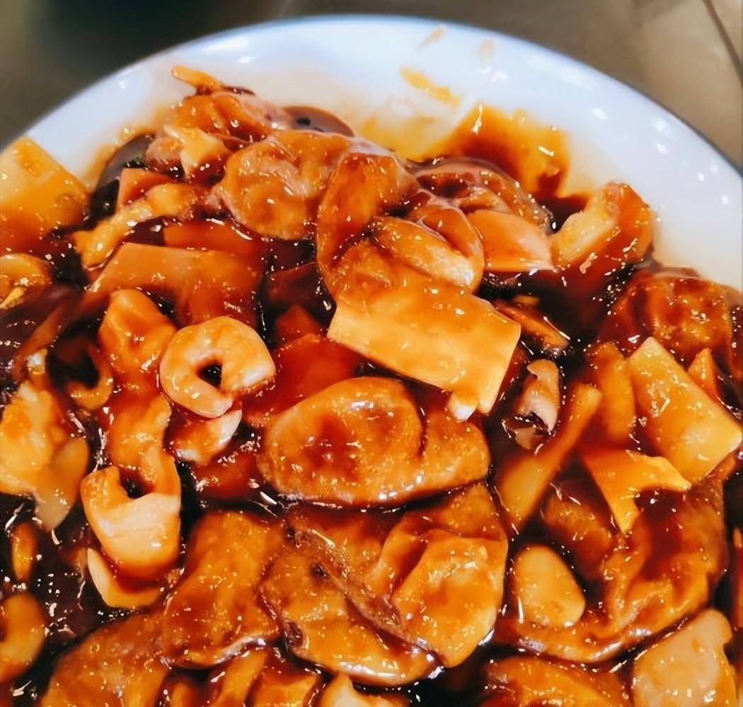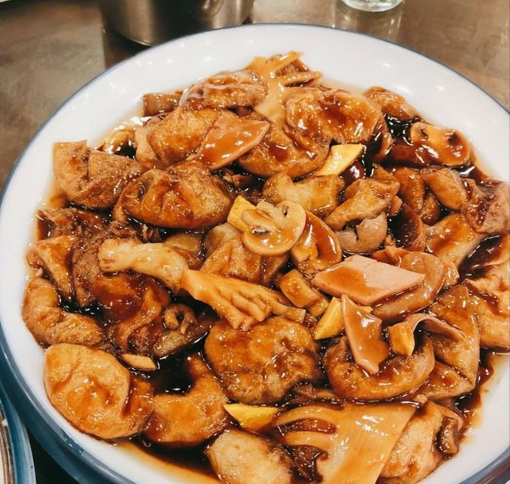 什锦面筋也是无锡菜的代表作,里面可不仅仅有面筋,用料非常丰富,像虾仁笋片肉片啥都有,食材丰富料也很大,尤其是这个面筋,炒得很入味,咬一口直接爆汁,整盘菜也是浓油赤酱,酱汁浓郁,不愧是下饭神器。