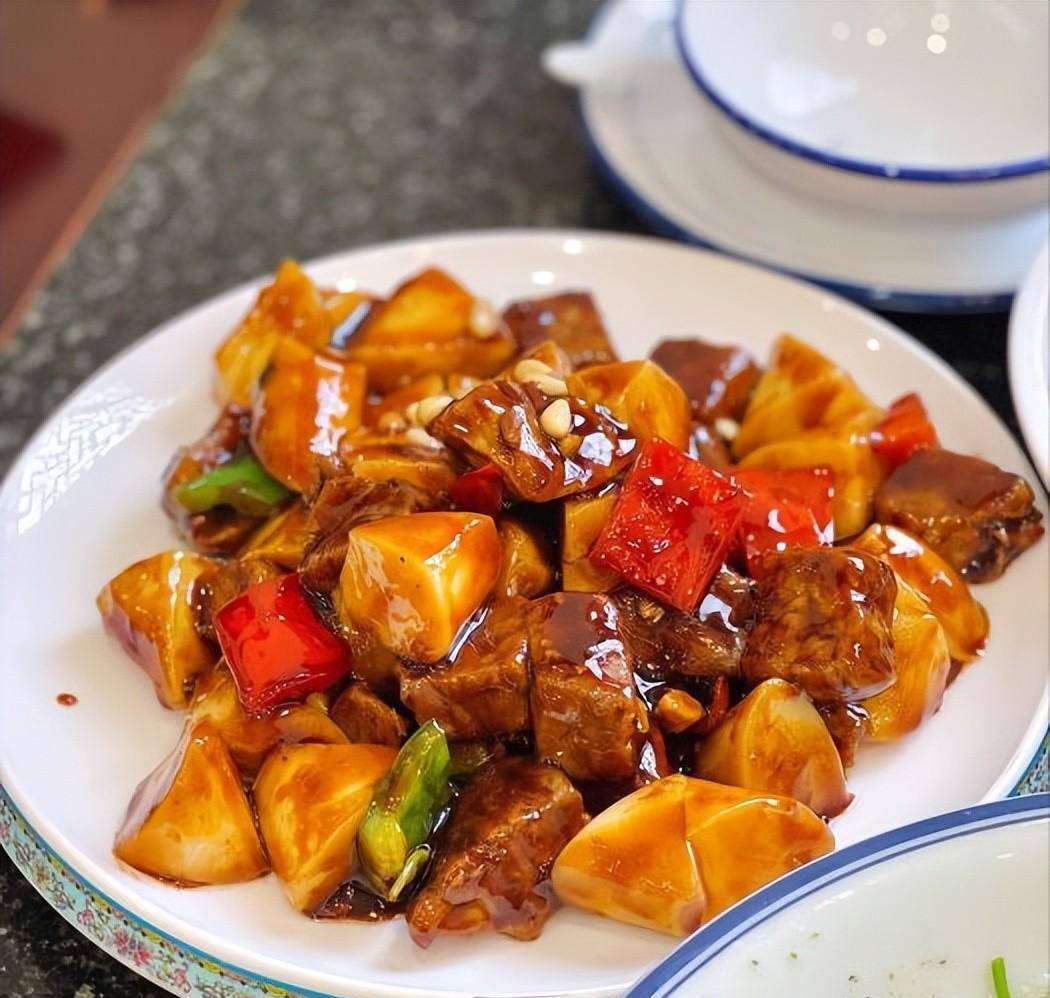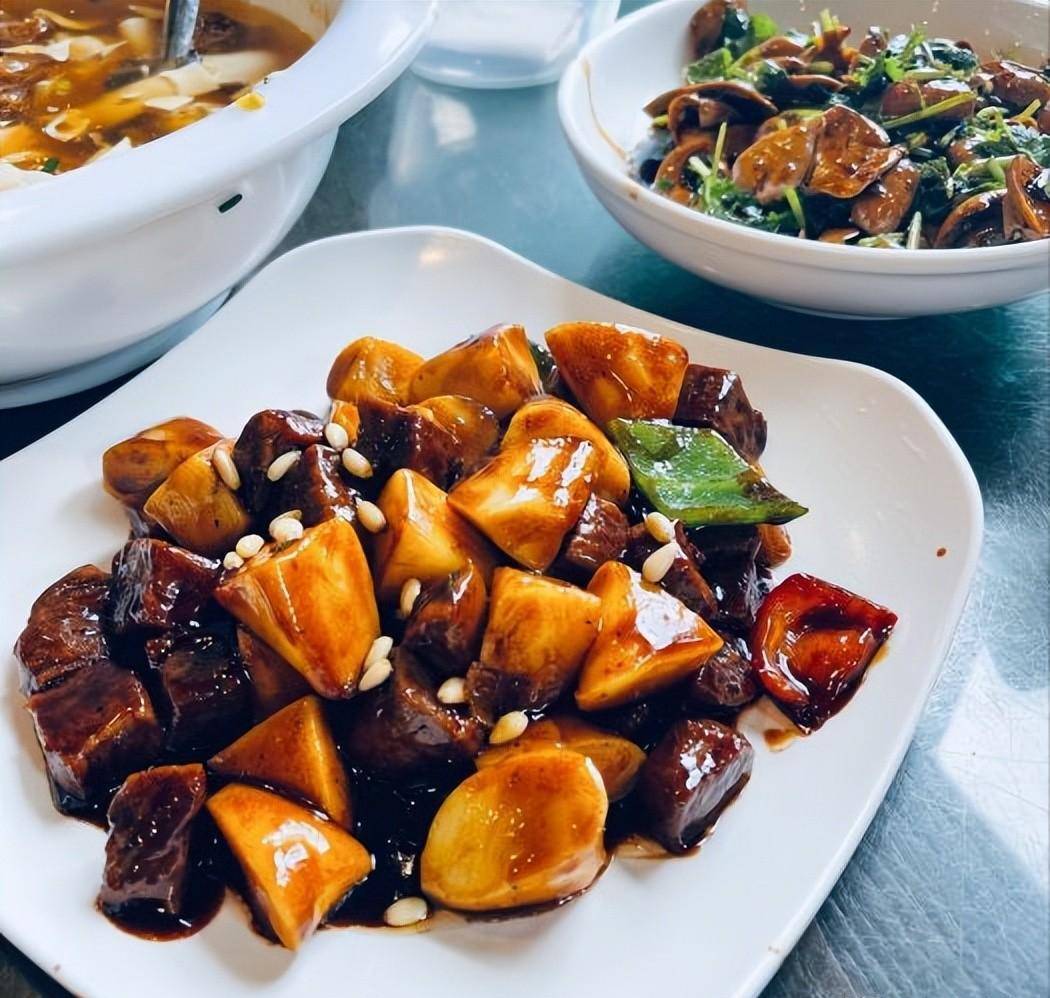 像这个松子牛肉炒年糕,就是以年糕为主,拌上大块的牛肉粒一起翻炒,以甜味为主,口感浓郁香甜,年糕和牛肉粒的分量都很扎实,牛肉新鲜味道好,年糕Q弹不会粘牙,软糯入味特别香,整个口感就是酱香味加黑胡椒的味道,吃起来不管味道和分量,都很符合东北人的喜好。