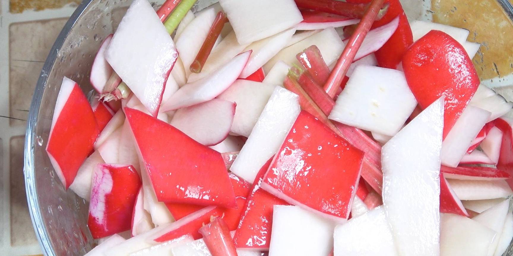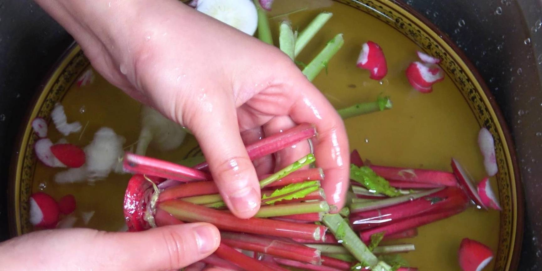 一般买萝卜的时候都会带萝卜杆,四川的这个红皮萝卜的杆比较脆嫩,所以也可以一起用来做。但是常见的白皮萝卜的杆就很老,就不适合用来做菜了,所以就直接削掉即可。