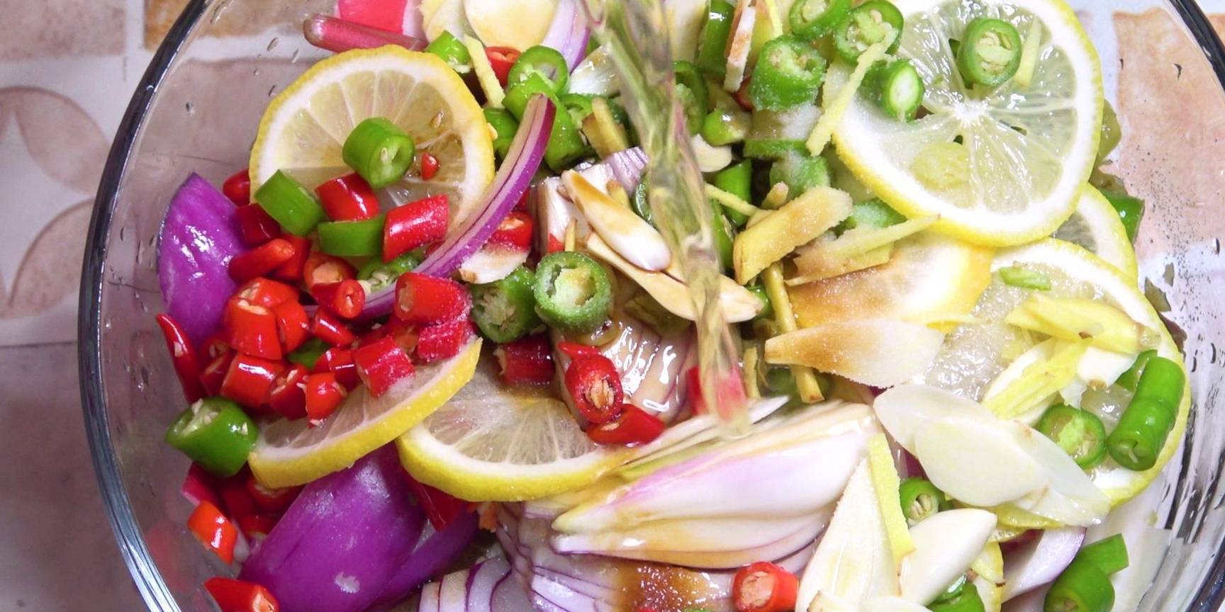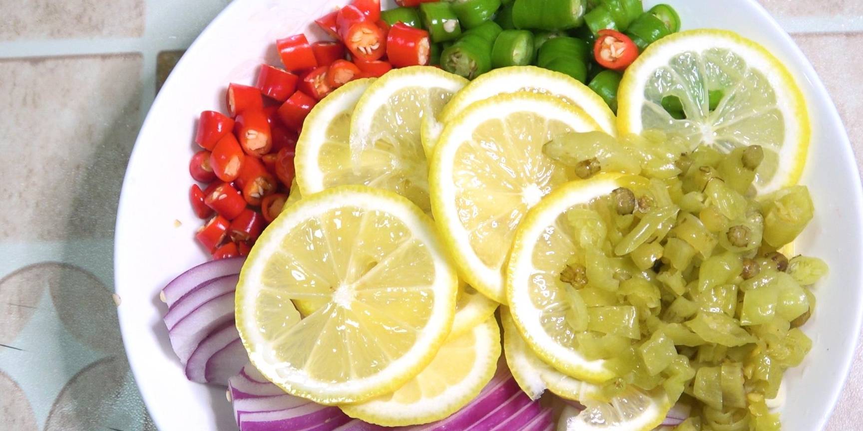 小半颗洋葱切丝备用,切洋葱一定要快,这样就不会辣到眼睛,切丝可以让洋葱更好的出味。再准备一个柠檬,去掉两头,切成薄片。一定要加柠檬,它会让做出来的菜美味翻倍。把柠檬里的籽去掉,不然做出来的菜会发苦。接着切一点泡山椒,这个泡山椒比较辣,不太能吃辣的就少加一点,但是不能不加,因为泡山椒的味道是任何调味品都无法替代的。