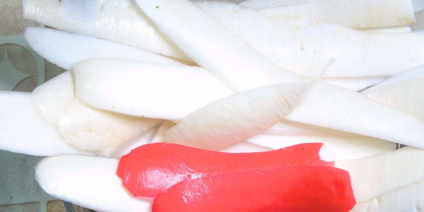 首先把萝卜的两头和有疤的地方去掉,然后用水把萝卜清洗干净。大家选萝卜的时候最好是选择表皮看起来很新鲜,没有发蔫的状态。尽量选择根须比较少的萝卜,这样的萝卜会更脆嫩。我选用的是四川的红皮萝卜和白皮萝卜,为了好看我才用的2种颜色的萝卜。