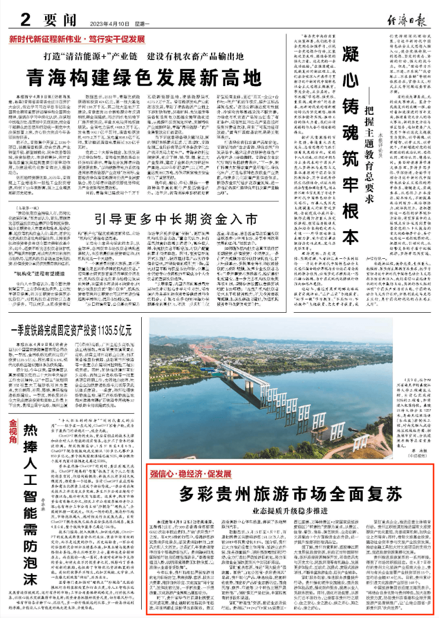 4月10日,《经济日报》刊发《多彩贵州旅游市场全面复苏 业态提质升级稳步推进》,报道今年以来,贵州瞄准世界级旅游目的地的目标定位,聚焦资源、客源、服务三大要素,用好自然珍宝、文化瑰宝“两个宝贝”,发挥比较优势,一手抓流量、一手提质量,文化旅游产业展现出蓬勃活力。具体报道如下: