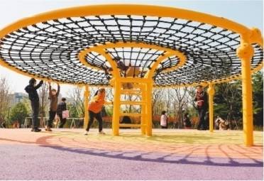 4月9日,小朋友在山东省青岛市即墨区一处“口袋公园”游玩。周末,在山东省青岛市即墨区,众多市民来到“口袋公园”休闲游玩,享受春日美好时光。