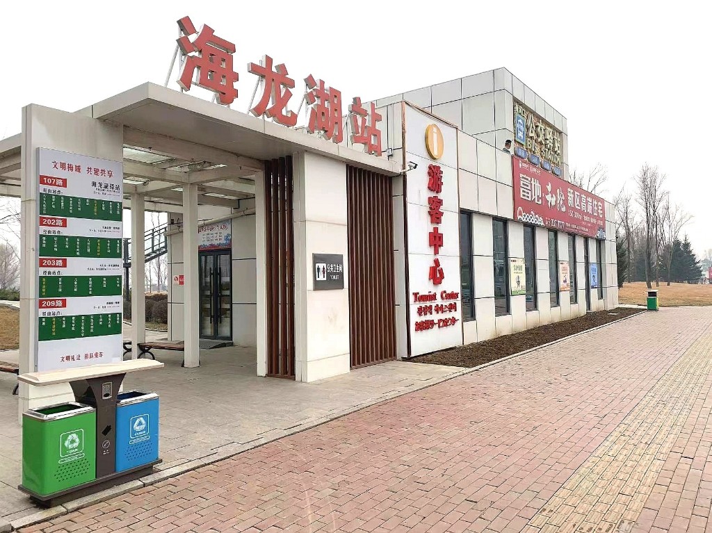 王琳口中的梅河口市海龙湖公交驿站位于海龙湖景区正门附近。记者看到,驿站分为两层,共398平方米,内有桌椅、咖啡售卖机、饮水机、共享充电宝、电视、空调、wifi等。在这里,乘客冷了可以取暖,热了可以避暑,渴了可以喝水,累了可以歇脚。另外,公交驿站内设有无障碍卫生间,方便乘客如厕。乘客还可乘坐电梯来到二楼露天观景台远眺海龙湖。