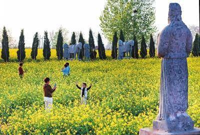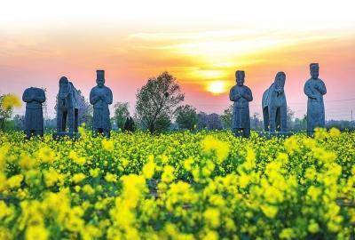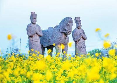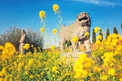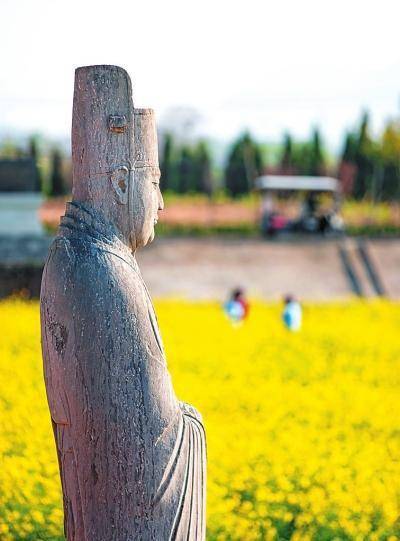 近日,巩义北宋皇陵保护区内,油菜花正在绽放,神道石像生安静矗立其中。