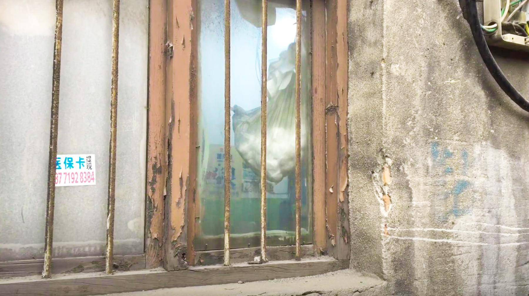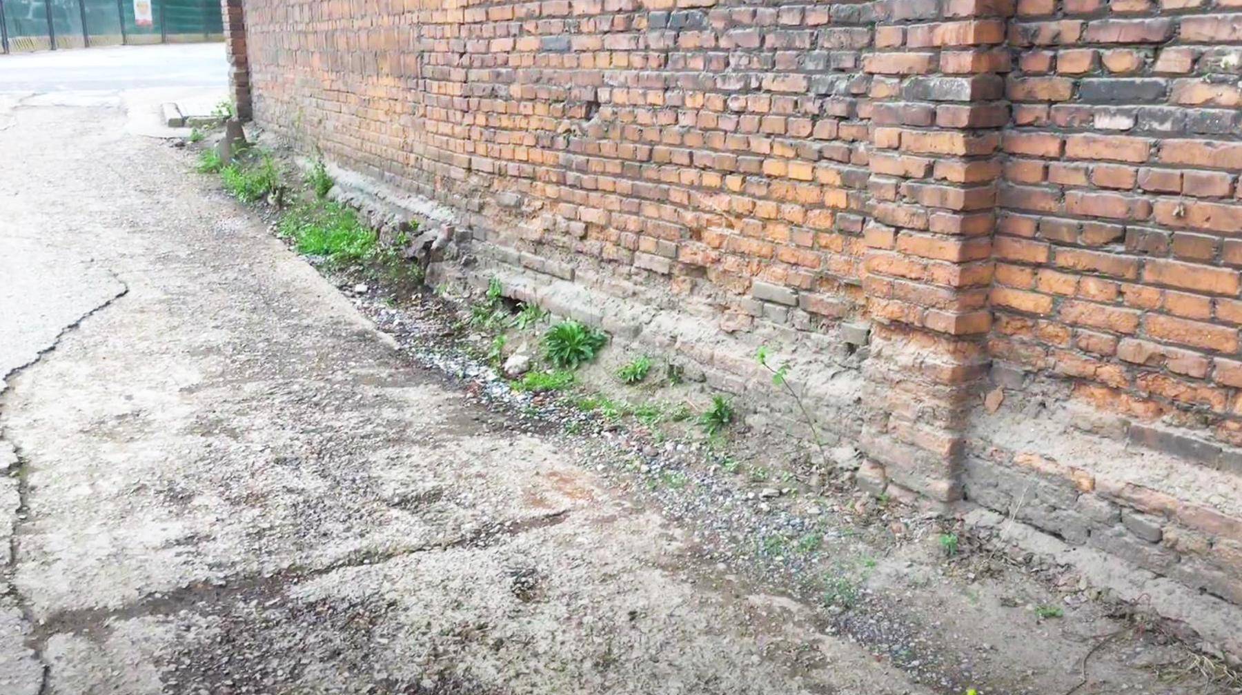 从仓库处走过,近距离看建筑,又有另外的即视感。首先是建筑的地基,与水泥路面已经完全融合,部分区域风化严重,堆积了碎石头。就是这样的环境,墙角和路面,仍然堆积生长了厚厚的苔藓,显示出绿油油的画面感。而因为屋檐伸出来的瓦片阻挡,墙角的路面一直是干涸的状态,脚踩上去像是摊到了沙坑中,很像小时候玩的泥浆。从这个角度仰望仓库的屋檐,墙壁的垂直角度大,窗户紧闭,布满灰尘,还有一个大大的“拆”字。