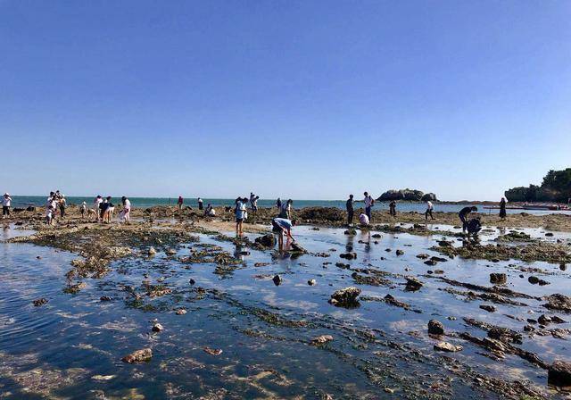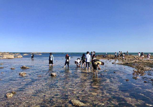 下午一点多,是这里落潮的时候,也是当地人来这里赶海的最好时候。如果你选择的时间刚好,潮水落得彻底,那么在这里,你将会有很意外的收获。配着蓝天白云和清澈的大海,在礁石下翻找着各类海货,也是种十分有成就感的事儿。
