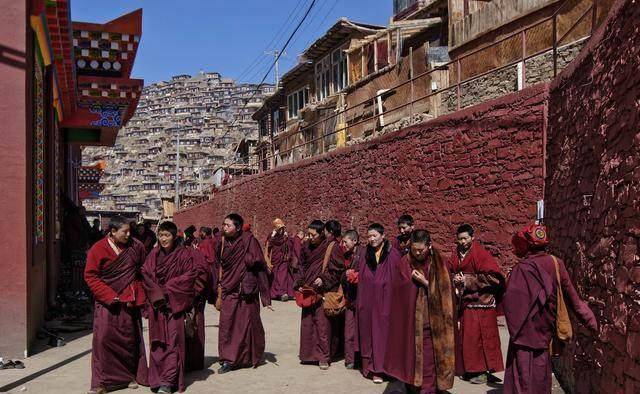 色达佛学院是世界上最大的藏传佛学之一。这里的僧舍很壮观,连绵数公里的山谷布满了密密麻麻的小木棚屋。谷底和山梁上分布着几座寺庙和佛堂,建筑规模虽都不很大,但装饰考究而辉煌;身披桨红色僧袍的喇嘛和尼姑来来往往,空气中充满生机和祥和气氛。