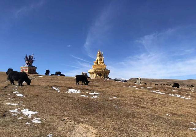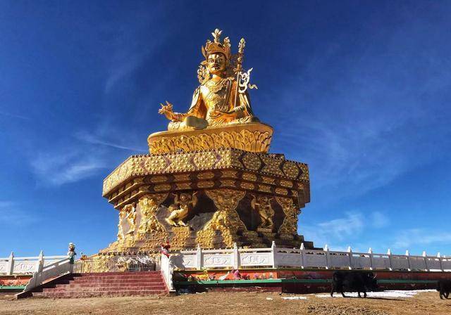 而莲花生大士佛像,就屹立在草原之上,远远望去,心生敬畏。
