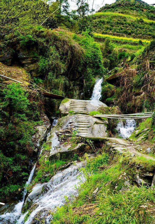 如果想看谷丰村的全貌,你必须得走到村子对面的山头,穿过一户户人家之后,你会发现在去山头的路上有一处瀑布。汩汩流水从更上面的村子里留下来,显得颇有意境。不过据当地村民说,因为谷丰村上面还有村子,所以这个瀑布的水村民是不喝的,他们的水都是用水管从山上的山泉接下来的山泉水。