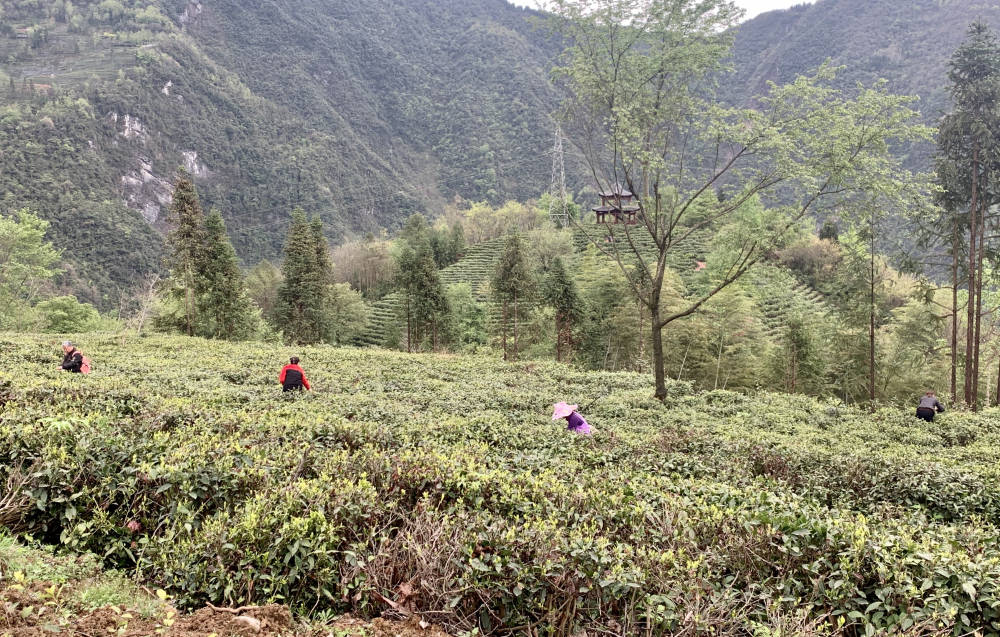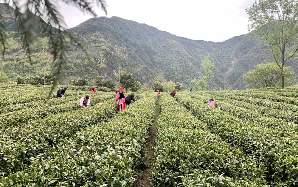 雨润羌山绿,风催茶飘香。盖头山茶园面积约1000亩,2006年被认定为有机茶园,由北川羌山雀舌茶业有限公司采用“公司+农户+合作社”的模式管理运营。从3月中下旬开始,茶园的茶树就陆续进入了采摘期。