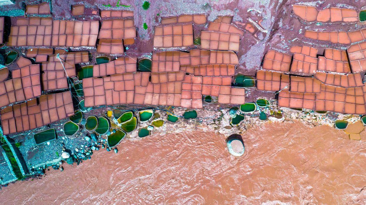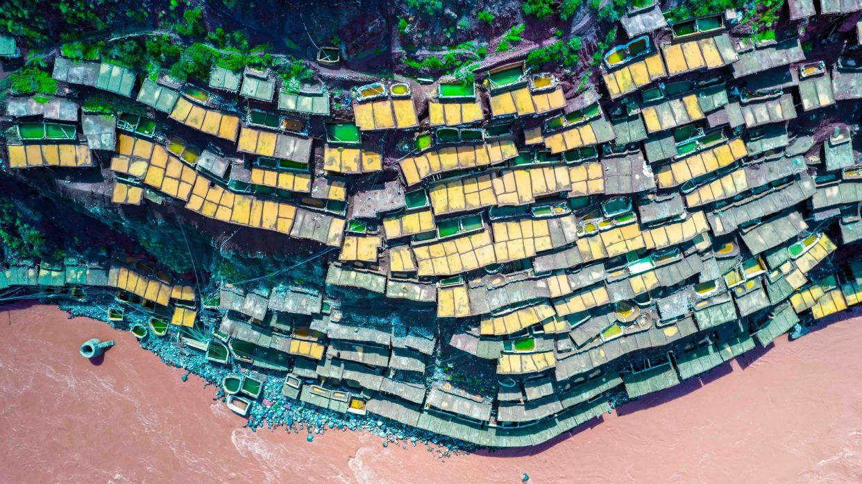 由一根根木桩搭建成的数千个平台,就这么高低有序地错落在沧澜江两畔的斜坡上。若是从高处俯瞰,便会发现眼前大大小小的盐田果真像极了少女们的眼影盘。如果以碧绿的江水为界,那么东岸便是大地色系,而西岸则是红棕色系。也正是因为东西两畔不同的土质,才造就了颜色迥异的白盐与红盐。