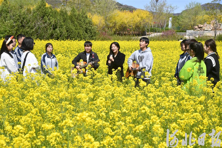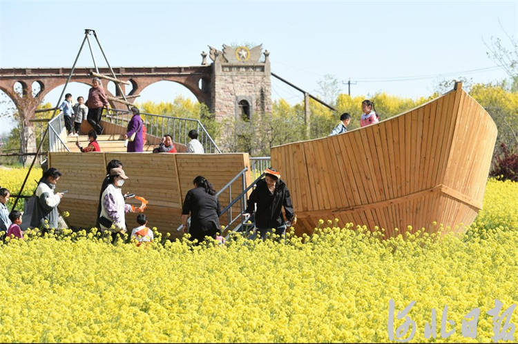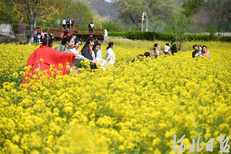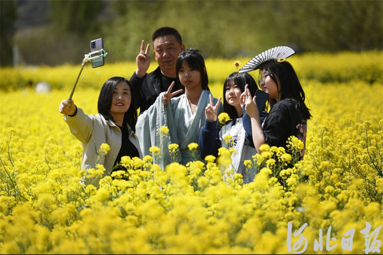 4月8日,游客们在位于石家庄市鹿泉区铜冶镇岭底村的百亩油菜花海中赏花游玩,乐享时光。