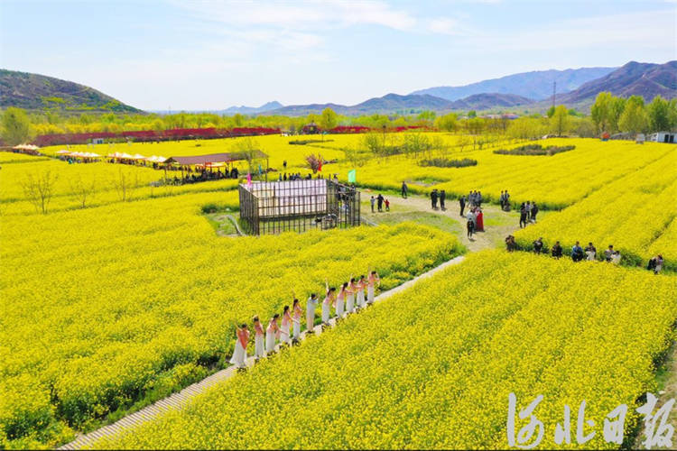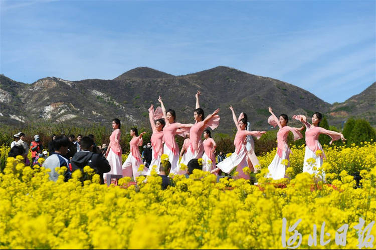 4月8日,演员在石家庄市鹿泉区铜冶镇岭底村的百亩油菜花海现场进行舞蹈表演。