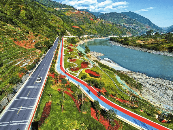 游客如以泸水境内的小沙坝服务区为起点,沿着绿道漫步或骑行,可尽享怒江美丽公路带来的全新服务。绿道慢行骑行系统融入住宿、自行车租赁、探险支线指引系统、沙滩栈道等,联动周边景区景点、遗址遗迹、传统村落,为游客提供了多种体验方式。